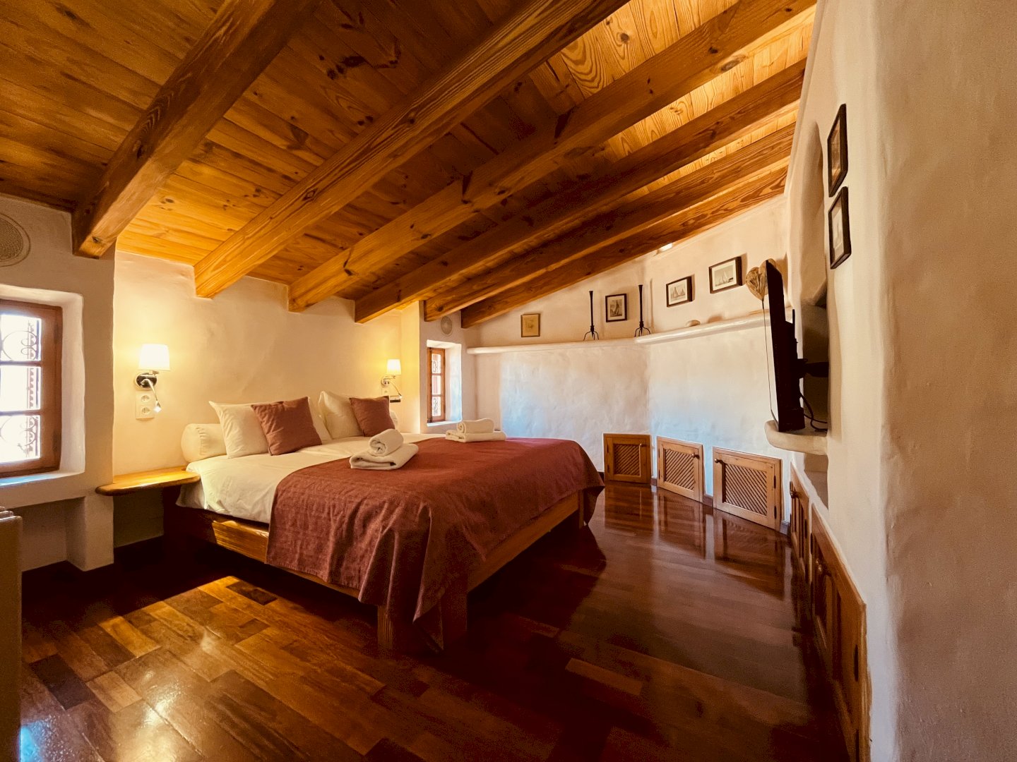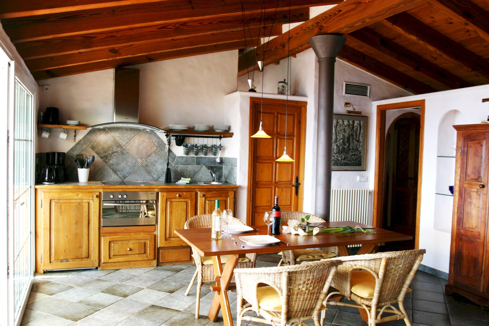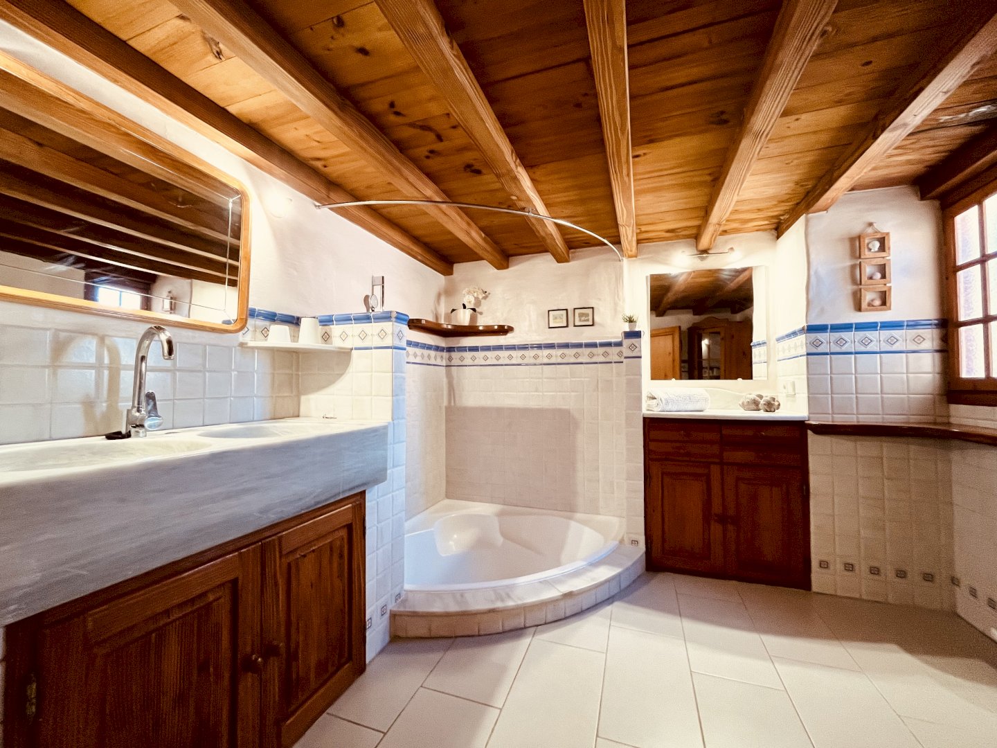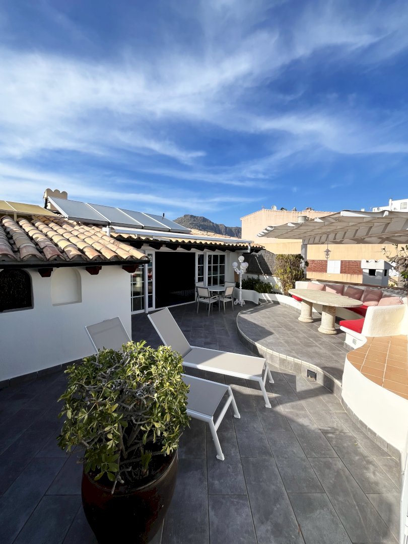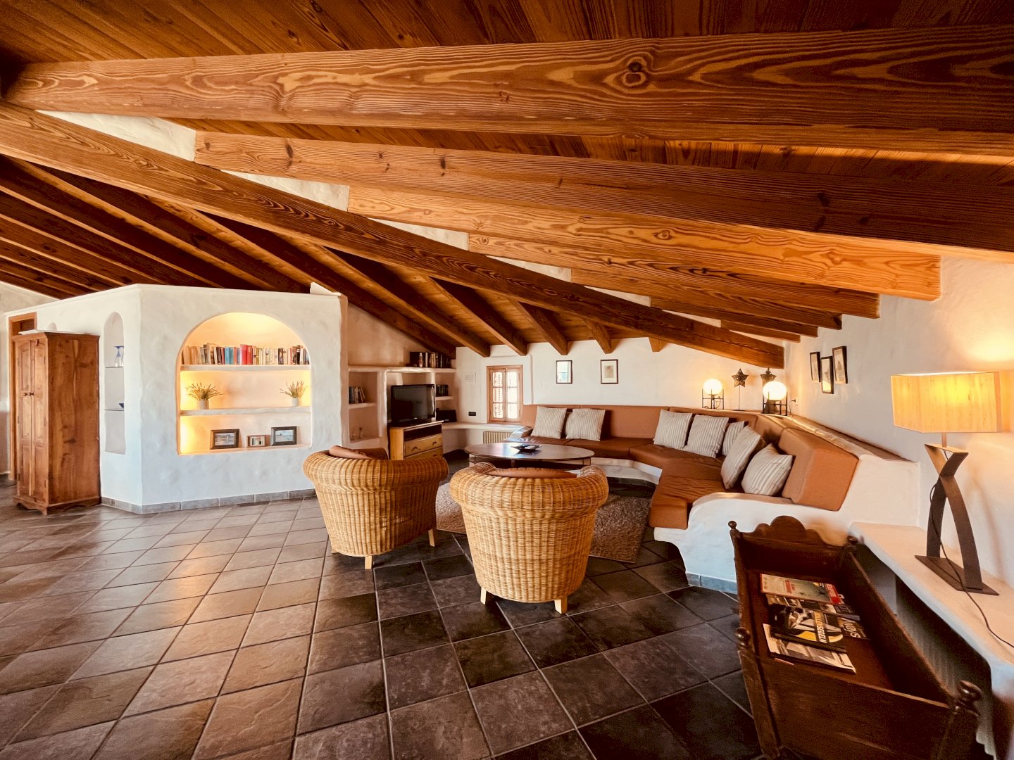 Desde el área de entrada del ático una escalera caracol conduce a la sala de estar abierta. Allí encontrará una amplia y cómoda zona de estar con TV vía satélite, ideal para relajarse y reunirse con amigos. Un sofá-cama se puede utilizar como cama para una o dos personas más. La cocina rústica ofrece una vitrocerámica, horno, nevera y lavavajillas. La mesa de comedor tiene espacio para 4 comensales. Al lado se encuentra el dormitorio doble con aire acondicionado y TV -Sat, un vestidor con mucho espacio para su ropa, un baño grande con bañera/ducha y lavabo. El WC está separado. El salón abierto conduce a la gran terraza. Ahí encuentran una amplia zona para comer, hamacas y una barbacoa.